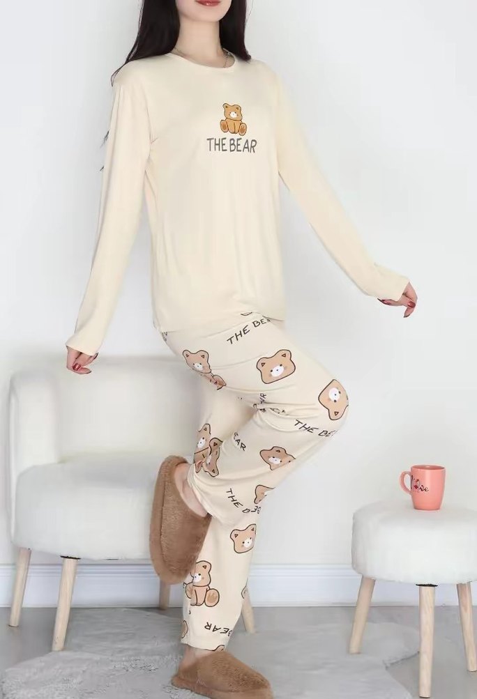 Uzun kollu, bol kesim kadın pijama takımı, beyaz pastel renkte ayı baskılarıyla. Üstte "THE BEAR" yazısı ve ayı figürü bulunur. Yumuşak kumaşla rahat kullanım sağlar.