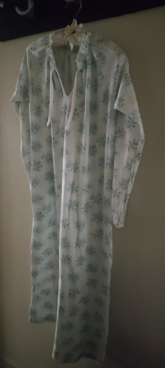 Bu kadın geceliği beyaz zemin üzerine pastel bağlama desenleriyle uzun boy ve bol kesime sahiptir. Uzun kollu ve klasik vintage tarzındadır, rahat bir kullanım sunar.