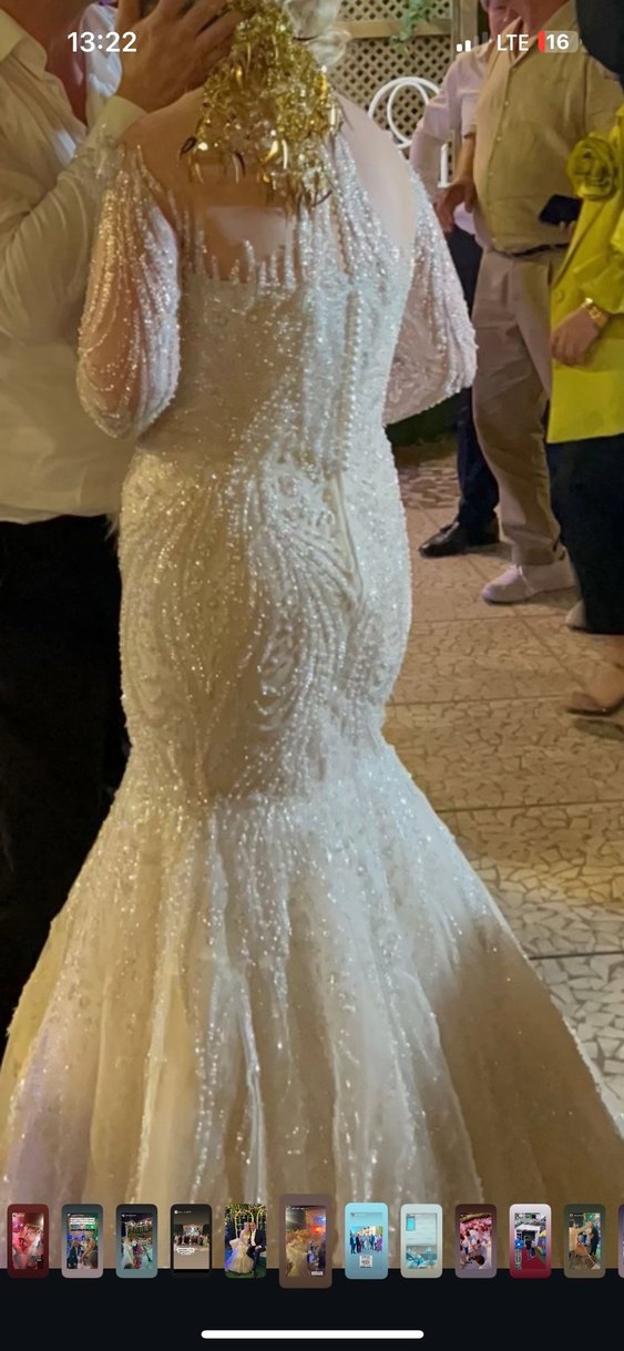 Bu uzun kollu, V yakalı balık kesim gelinlik, zarif boncuk işlemeleriyle göz alıcı bir görünüm sunar. Uzun boyu ve modern klasik stiliyle şıklık sağlar.