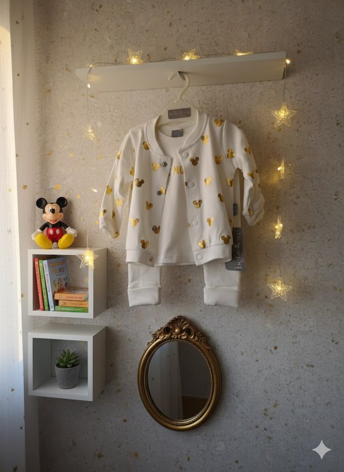 Uzun kollu, düğmeli ön kısmı olan beyaz bebek kıyafet seti. Hafif kumaş üzerine baskılı desenlerle rahat ve şık.3 lu takim