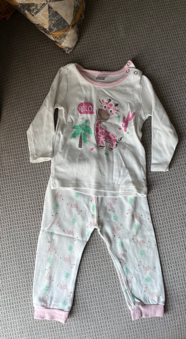 Uzun kollu beyaz üst ve pantolondan oluşan, örme kumaşlı bebek kız takımı. Üstte "HELLO" yazılı zürafa baskısı ve pastel detaylar bulunur. Pantolon pastel desenlidir. 12 18 ay sayılı kullanıldı yaka kısmında minik bir leke var fiyatı uygun tutuyorum