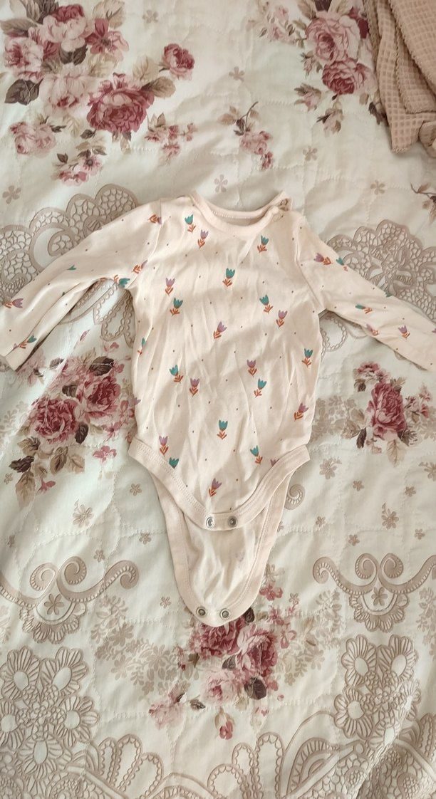 Uzun kollu, yuvarlak yakalı beyaz bebek body, pastel renklerde çiçek desenleri ve ince dantel detayları içerir.
