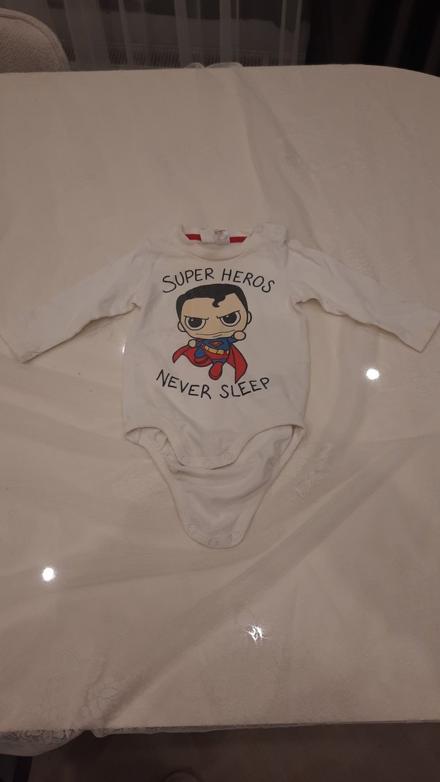 Uzun kollu, beyaz, baskılı süper kahraman desenli bebek body. Kolay giydirme için cırt cırtlı kapama özelliğine sahip. ♂️