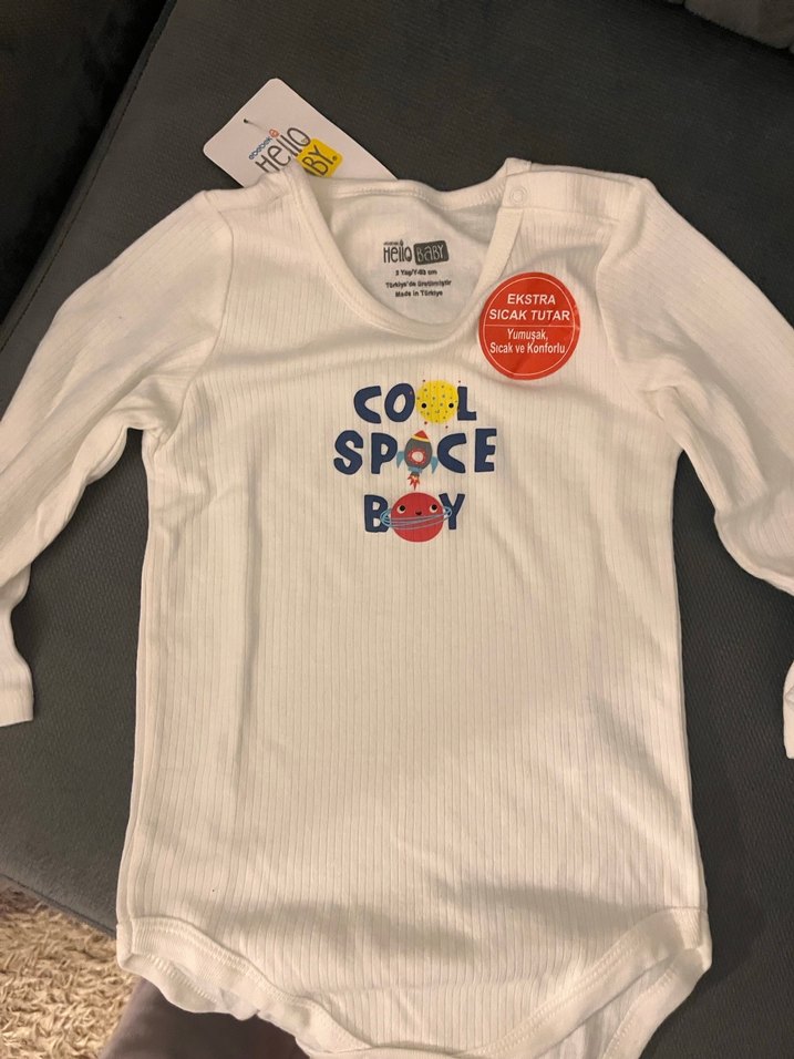 Yumuşak pamuktan uzun kollu beyaz bebek body, düğmeli ve eğlenceli baskılı desene sahip. Rahat ve sıcak tutar.
