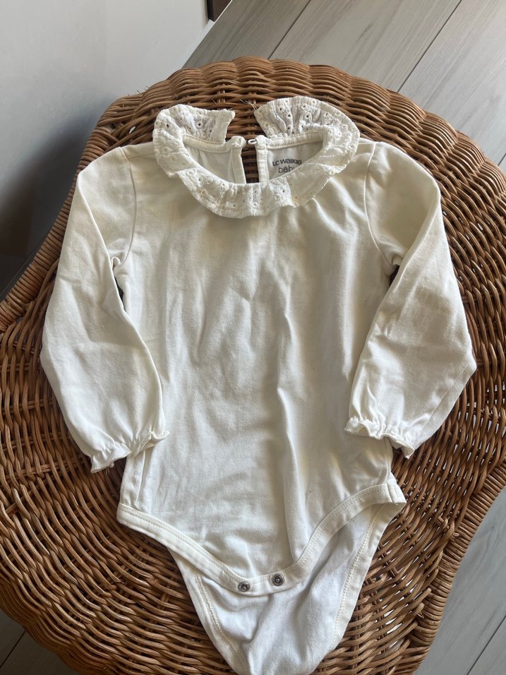 Uzun kollu, dantelli yakalı beyaz pastel renkte bebek body. Desensiz, rahat ve şık bir tasarıma sahiptir.