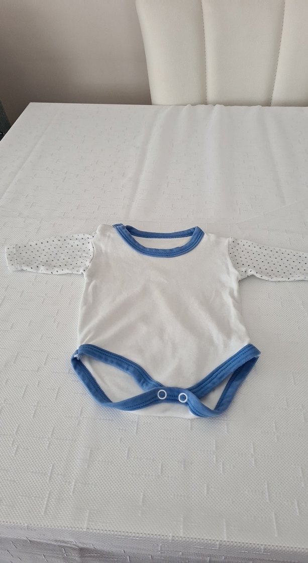 Mavi detaylı, uzun kollu beyaz bebek body. Yuvarlak yakalı ve yumuşak kumaşlı, kolları ince gri noktalı sade tasarım.