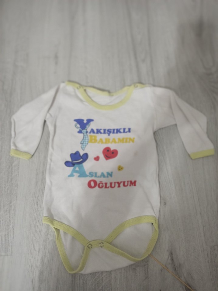 Uzun kollu, beyaz renkte, velcro kapamalı bebek body. Üzerinde renkli "Yakışıklı Babamın Aslan Oğluyum" yazılı baskı bulunur. Yumuşak kumaş ve bisiklet yaka rahatlık sağlar.