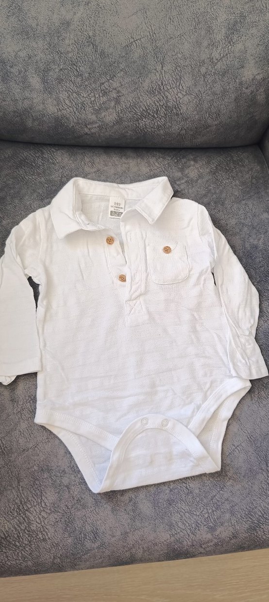 Düğmeli, uzun kollu beyaz bebek body. Pamuk kumaştan, yakalı ve önünde küçük bir cep bulunur. Altında kolay değişim için çıtçıt düğmeler vardır. hiç giymedik çok kıyafeti vardı bebeğimin sıra gelmedi hemen büyüdük
