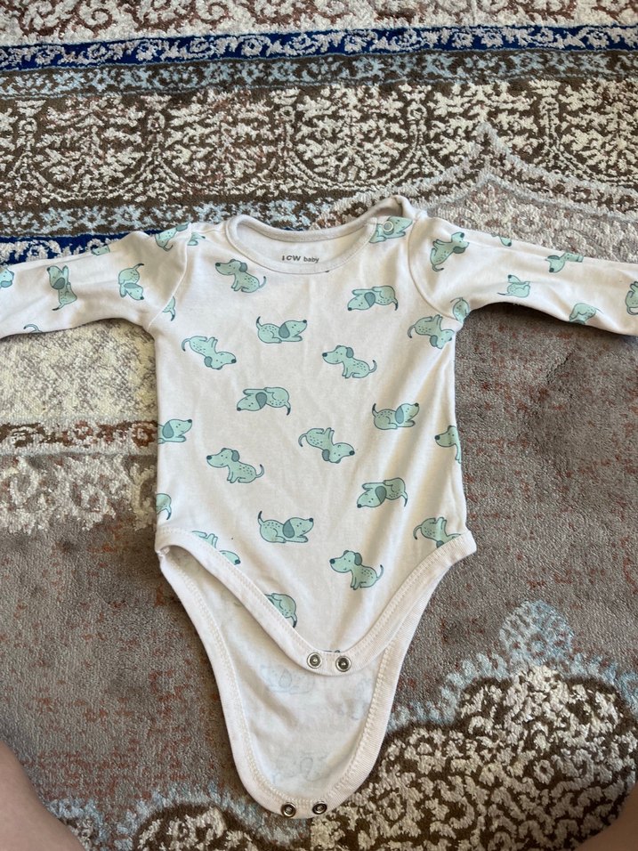 Uzun kollu, bisiklet yaka beyaz renkli, yumuşak örme kumaştan yapılmış bebek body. Alt kısmında çıtçıtlı ve pastel tonlarda hayvan desenleri bulunur.