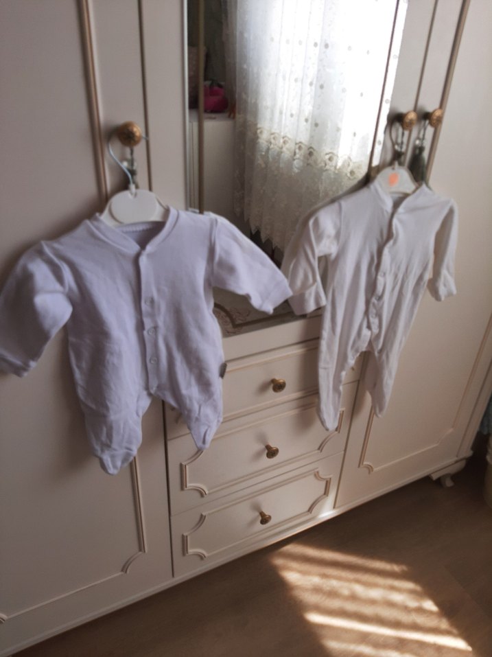 2 adet fiyatiPamuklu, düğmeli, uzun kollu beyaz bebek hastane tulumu. Desensiz, sade normcore tarzında.
