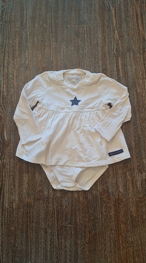 Bu bebek kız bodysi, uzun kollu ve yuvarlak yakalıdır. Hafif beyaz renkte, yumuşak kumaştan yapılmıştır. Göğsünde küçük yıldız detayı bulunan sade ve desensiz tasarıma sahiptir.