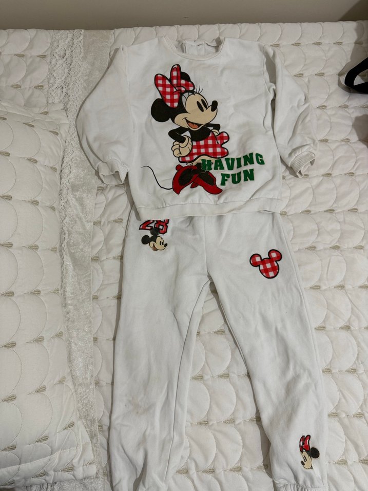 Beyaz uzun kollu üst ve eşofmandan oluşan bebek kız takımı, renkli baskılı Minnie Mouse figürleri içerir. Üstte 'HAVING FUN' yazısı bulunmaktadır.