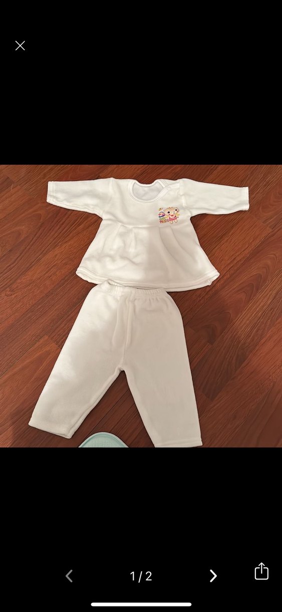Uzun kollu beyaz üstü renkli baskılı ve düğmeli, yumuşak beyaz pantolonla tamamlanan bebek kız takımı. Peluş çok yumuşak Amerika’dan hediye geldi kaliteli