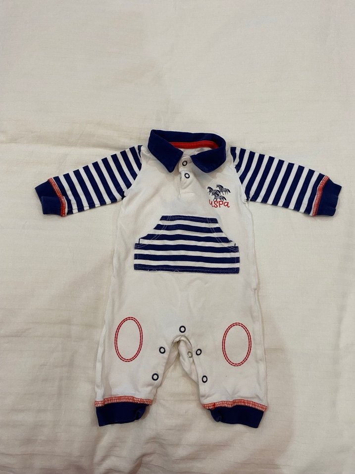 Uzun kollu, yakalı ve renkli çizgili kollara sahip bebek tulumu. Düğmeli ve baskılı detaylar içerir, yumuşak ve sıcak kumaştandır. 1 defa kullanıldı. Sıfır ayarındadır, herhangi bir yırtığı söküğü deformesi yoktur. 0-3 ay aralığına olur. Orjinal üründür, uspa mağazasından alınmıştır. İade kabul etmiyorum dikkatle inceleyiniz lütfen. makul teklifleri kabul ediyorum. Marka temsilidir. #zara #mango #hm #koton #ipekyol #yargıcı #küpe #aksesuar #kolye #takı #takıseti #bileklik #lcw #lcwakiki #bebekelbise #kızçocukelbise #erkekpantolon #erkekgiyim #erkektencelpantolon #ramsey #erkekyazlıkpantolon #kadınelbise #uzunelbise #tesettürelbise #tesettürgiyim #yazlıkelbise #günlükelbise #defacto #kadınceket #günlükceket