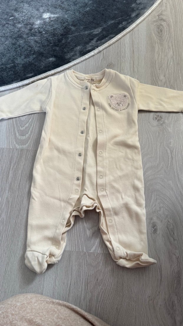 Pastel beyaz renkte, uzun kollu ve düğmeli bebek tulumu. Yumuşak ve sıcak kumaştan üretilmiştir, rahat kullanım sağlar.