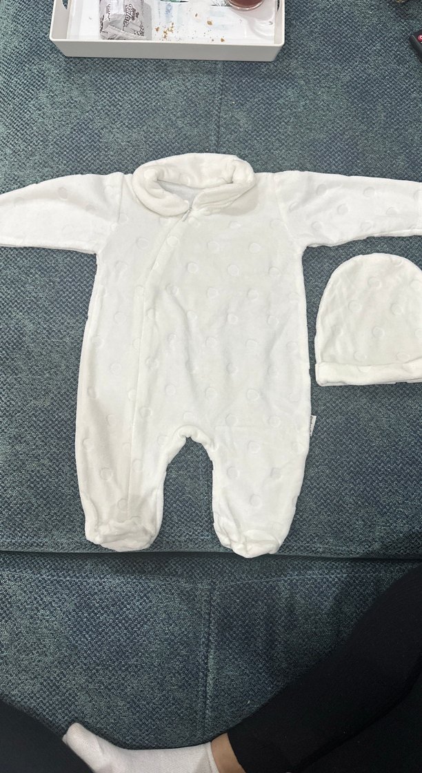 Yumuşak ve sıcak kumaştan yapılmış, düğmeli uzun kollu beyaz bebek tulumu. Rahatlık için uyumlu şapka dahildir. Beklemeden dolayı sararmalar mevcut o yüzden fiyatı uygun