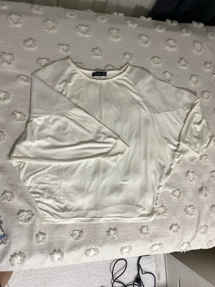 Sadece 1 kere giyildi. Hiçbir deformasyonu yoktur. File detaylı ince tişörttür. %100 viskondur.