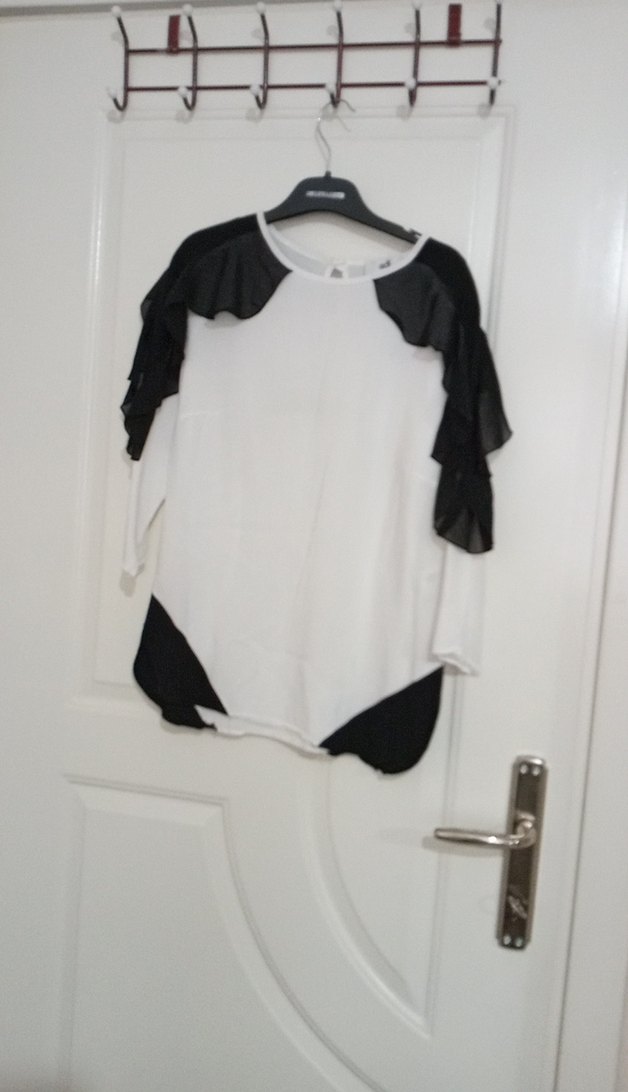 Kadınlar için uzun kollu, yuvarlak yakalı beyaz bluz, omuz ve yanlarda siyah fırfır detaylarıyla. Rahat kesimli, sentetik kumaştan, günlük sokak stili için uygundur. Desensiz ve normal boyda.