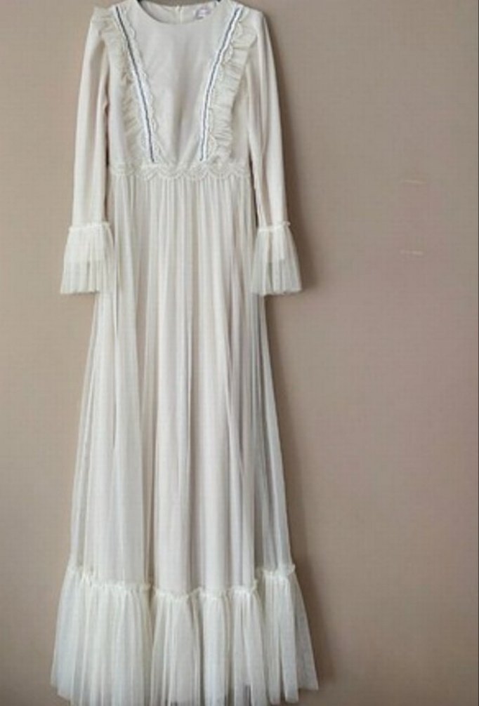 Uzun kollu, beyaz tul kumaştan içi astarlı işlemeli ve fırfırlı bohem tarzda rahat kesim elbise. Tekne yaka ve vintage düğünler için uygun. S-M uyumludur