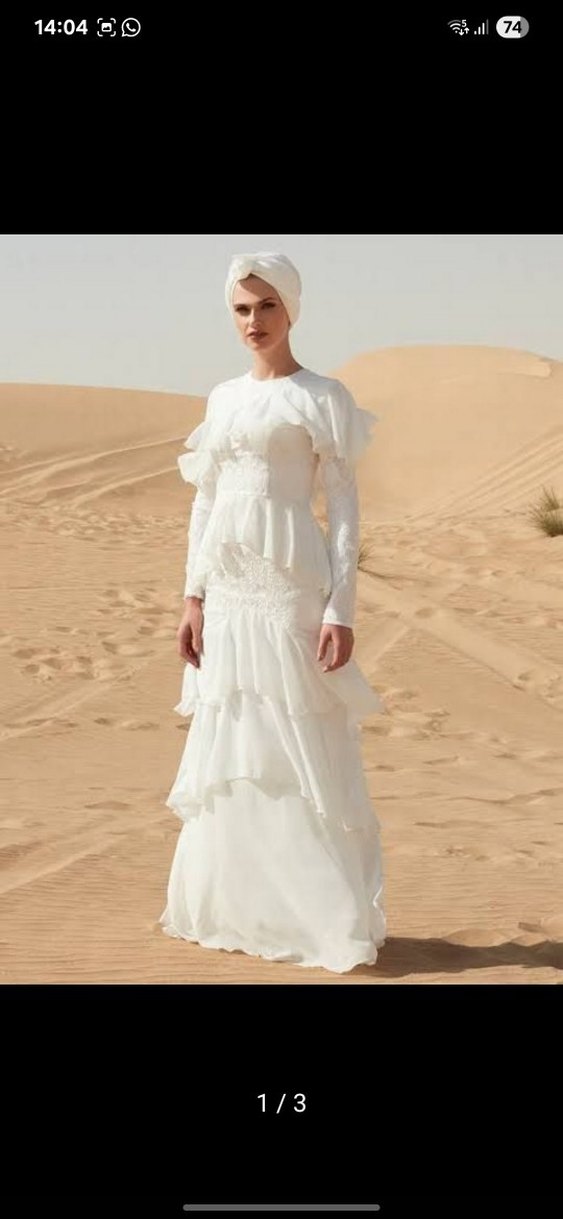 Uzun kollu, straplez yakalı, drapeli kat kat tasarıma sahip beyaz gelinlik, bohem tarzda ve sade kesimli.