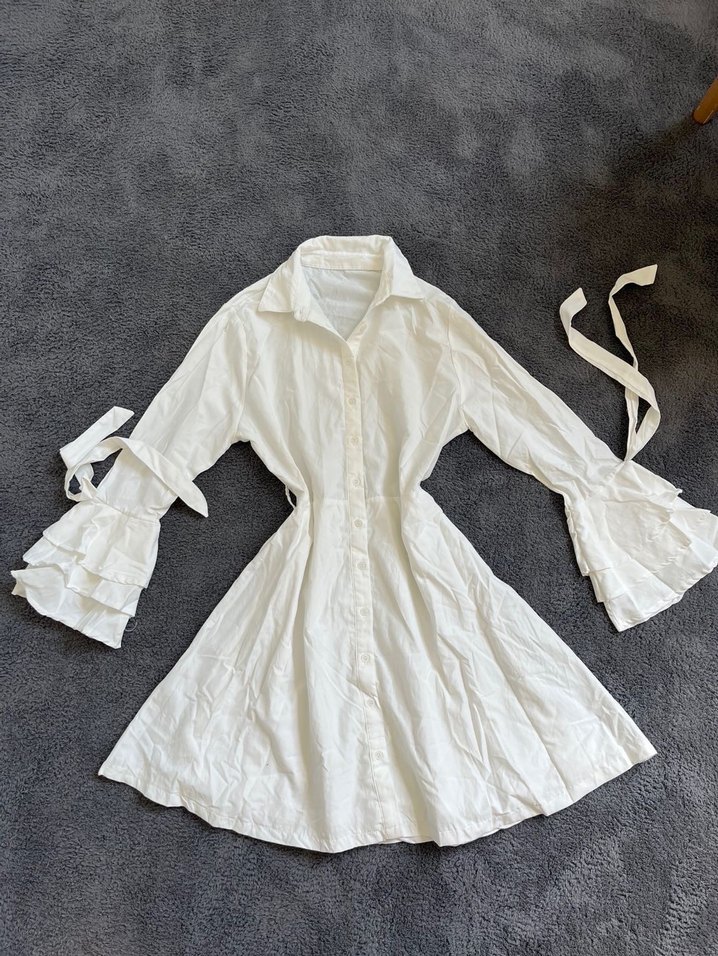 Uzun kollu, bol kesim beyaz elbise, katmanlı manşetler ve yakalı, Paris tarzı bohem görünüm sunar.