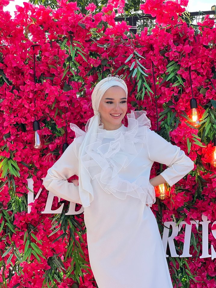 Uzun kollu, yüksek yakalı ve bol kesim beyaz elbise, etnik desenli drapeli detaylara sahiptir. Mütevazı, bohem düğünler için uygundur.