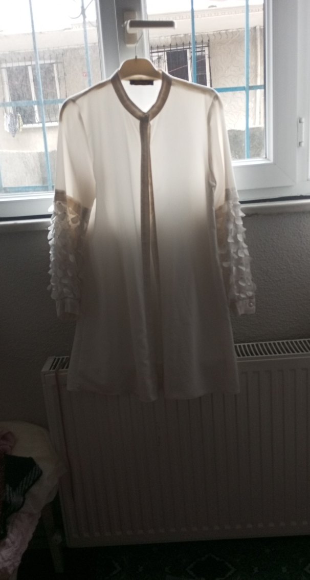 Uzun kollu, gevşek kesim beyaz kadın sabahlık, bohem ve minimalist tarzı bir araya getirir. Kollarda dokulu detaylar bulunur.