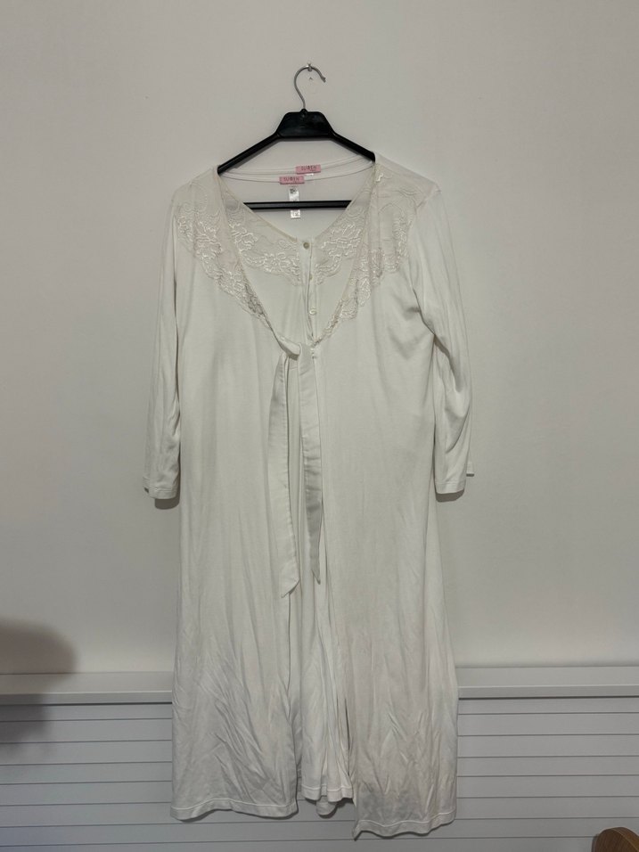 Uzun kollu, bol kesim beyaz kadın sabahlığı, bohem tarzda ve yakada ince dantel detaylarıyla rahat bir yapıya sahiptir.
