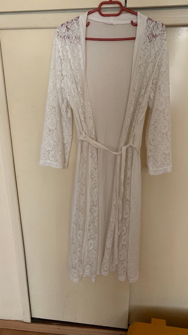Uzun kollu, bol kesim beyaz kadın sabahlığı. Hafif ve rahat kumaştan, bohem tarzda, belden bağlamalıdır. ☁️