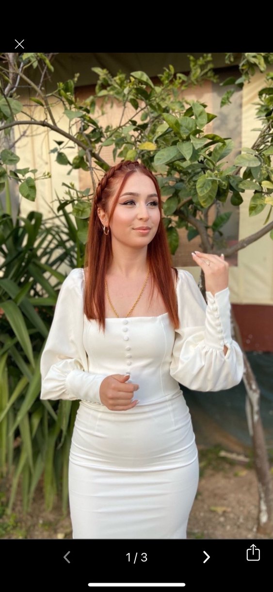 Düğmeli uzun kollu ve straplez yaka detaylı, beyaz bohem tarzda, düğünlere uygun, vücuda oturan midi elbisedir.