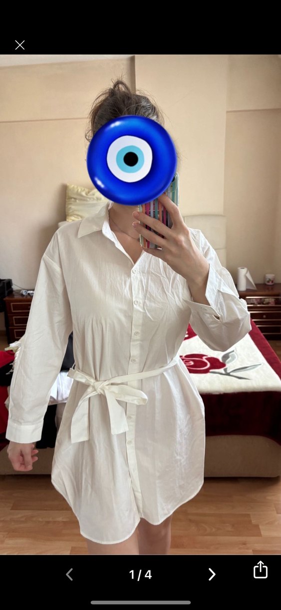 Pamuk kumaştan, uzun kollu, yakalı ve düğmeli beyaz gömlek. Midi uzunlukta, bol kesim ve belde bağcık detaylı bohem tarzda.