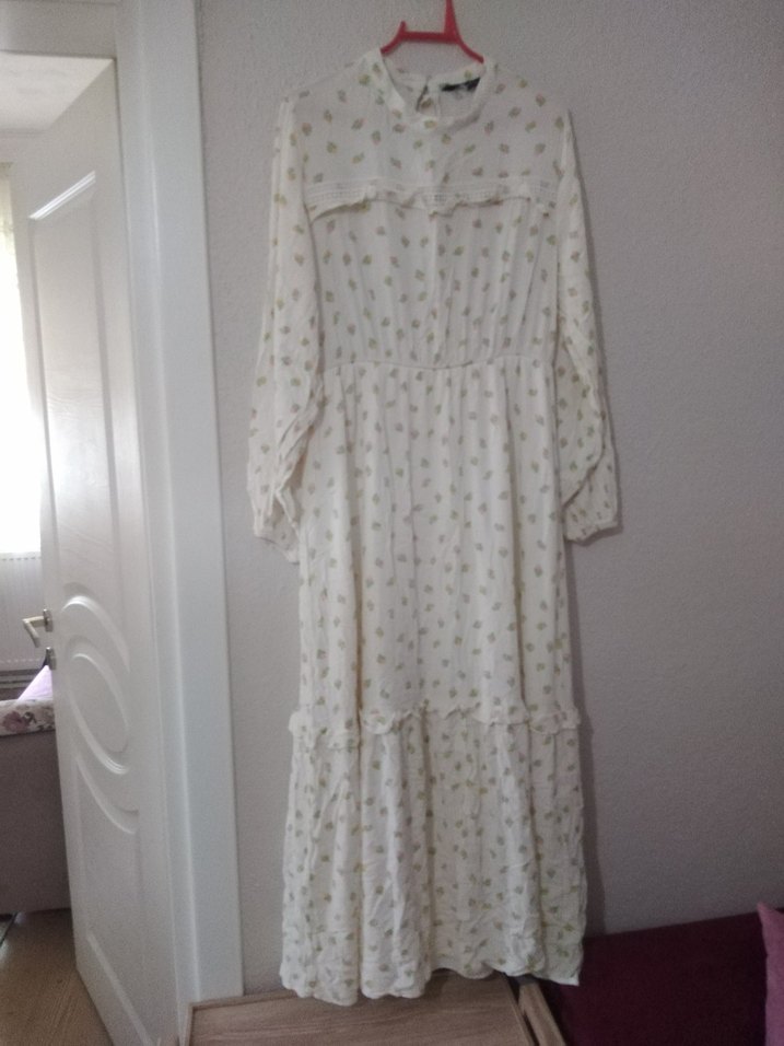 Pamuk kumaştan uzun beyaz elbise, bol kesim ve fırfır detaylı, yüksek yakalıdır. Uzun kollu ve pastel tonlarda, bohem tarz için uygundur.