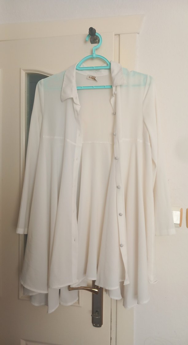 Bol kesim, uzun kollu, yakalı beyaz pamuklu gömlek. Düğmeli ve midi boy, bohem Paris tarzında rahat kullanım için uygundur.