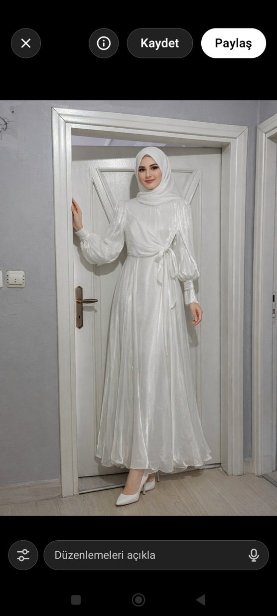Uzun Kollu Beyaz Bohem Tesettür Abiye Elbise