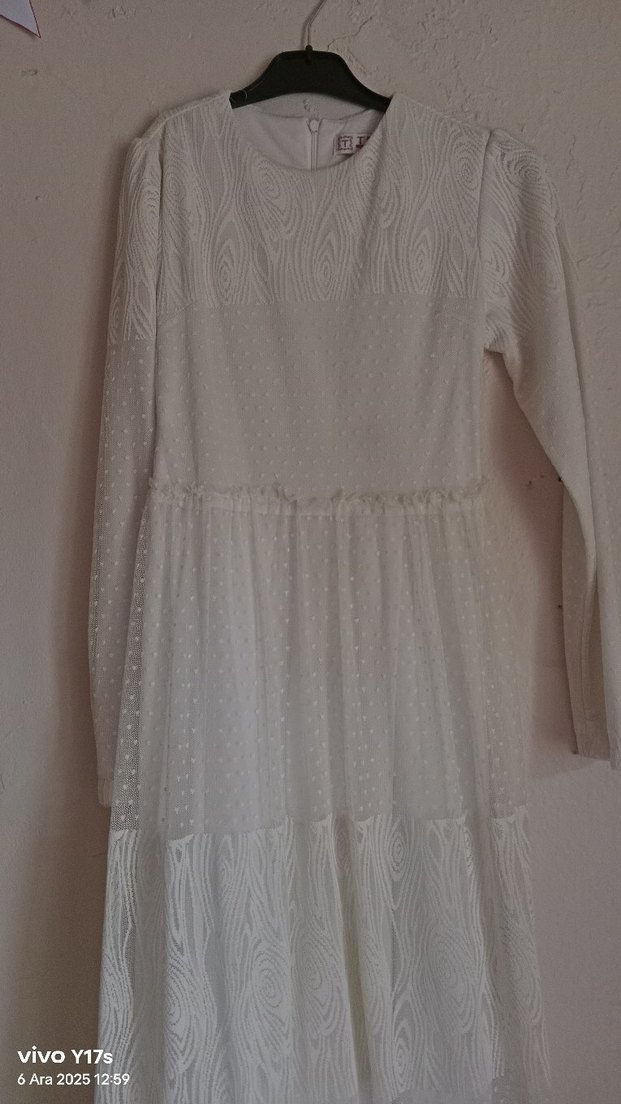 Uzun kollu, yuvarlak yaka ve bol kesim beyaz elbise. Fırfır detaylı ve hafif dokulu, düğün için uygun bir bohem tarzda elbise.