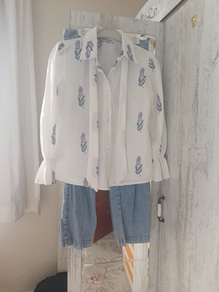 Gevşek kesim beyaz bluz, uzun kollu ve düğmeli, hafif çiçek desenli, sokak modasına uygun. gomlekte sarı leke pantolonda da var resimde çektim bakınız