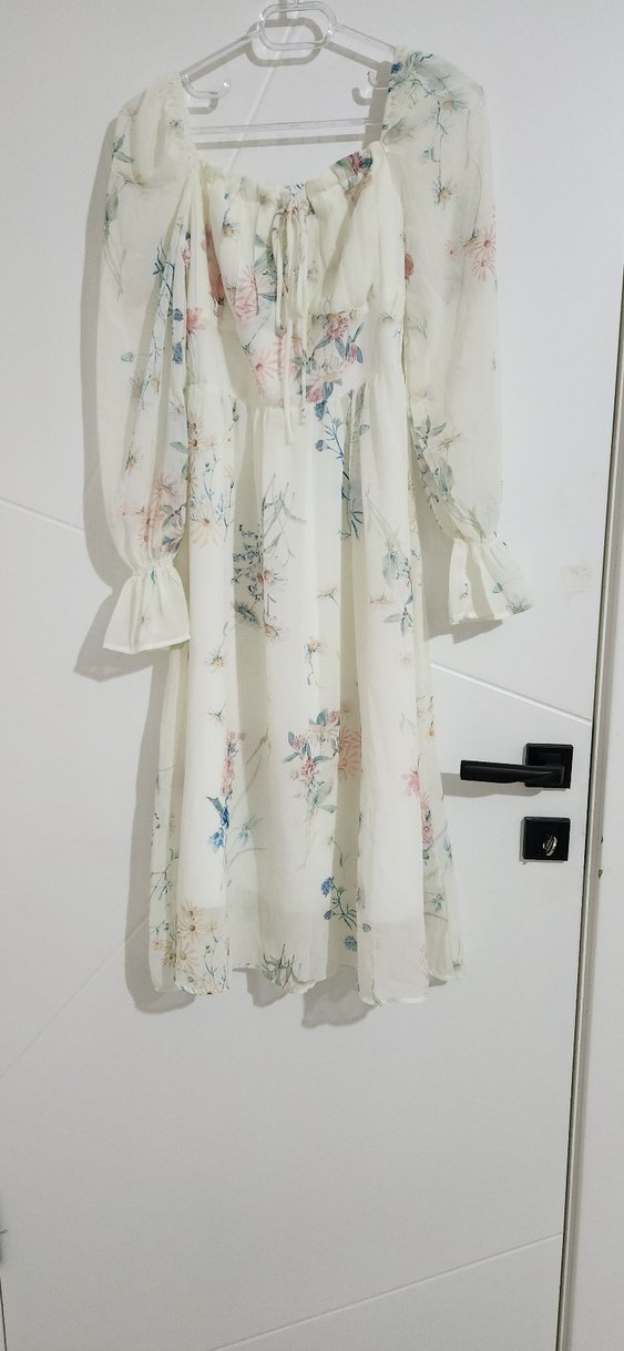 Uzun Kollu Beyaz Çiçekli Bohem Elbise