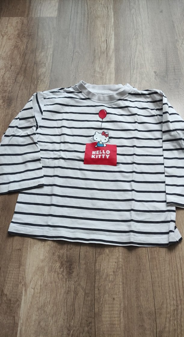 Kız çocukları için uzun kollu, bol kesim beyaz tişört, gri çizgili ve önünde Hello Kitty baskısı bulunur. Pamuklu, örme dokusu ve yuvarlak yakaya sahiptir.