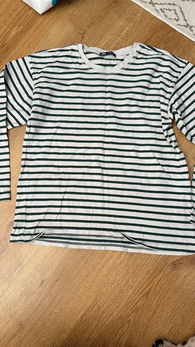 Uzun kollu, siyah yatay çizgili beyaz tişört, yuvarlak yaka ve rahat kesim. Yumuşak sentetik kumaştan, günlük kullanıma uygun.