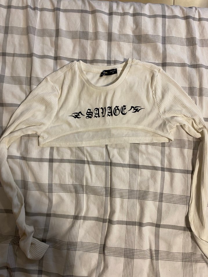 Yumuşak örme keten kumaştan, uzun kollu, bol kesim ve kayık yaka beyaz crop top. Üzerinde 'SAVAGE' baskısı vardır, gündelik sokak stili için uygundur. hiç giyilmedi
