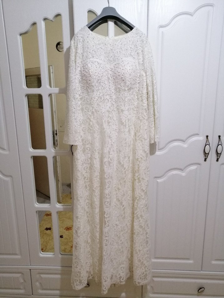 Uzun kollu ve tekne yaka olan beyaz dantel A kesim gelinlik, klasik ve zarif bir görünüm sunar. Rahat ve bol kesimdir.