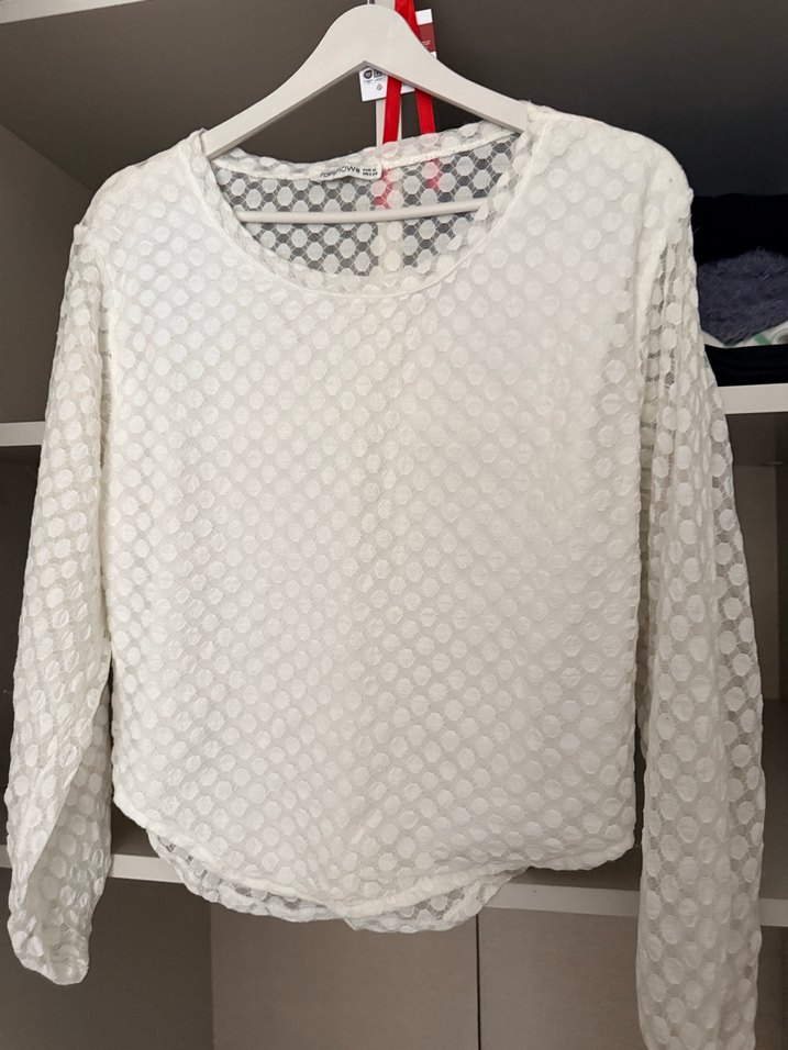 Uzun kollu, yuvarlak yaka ve dantel detaylı beyaz bluz, pamuklu yumuşak kumaştan, rahat kesimlidir. Arkası transparan tüldür