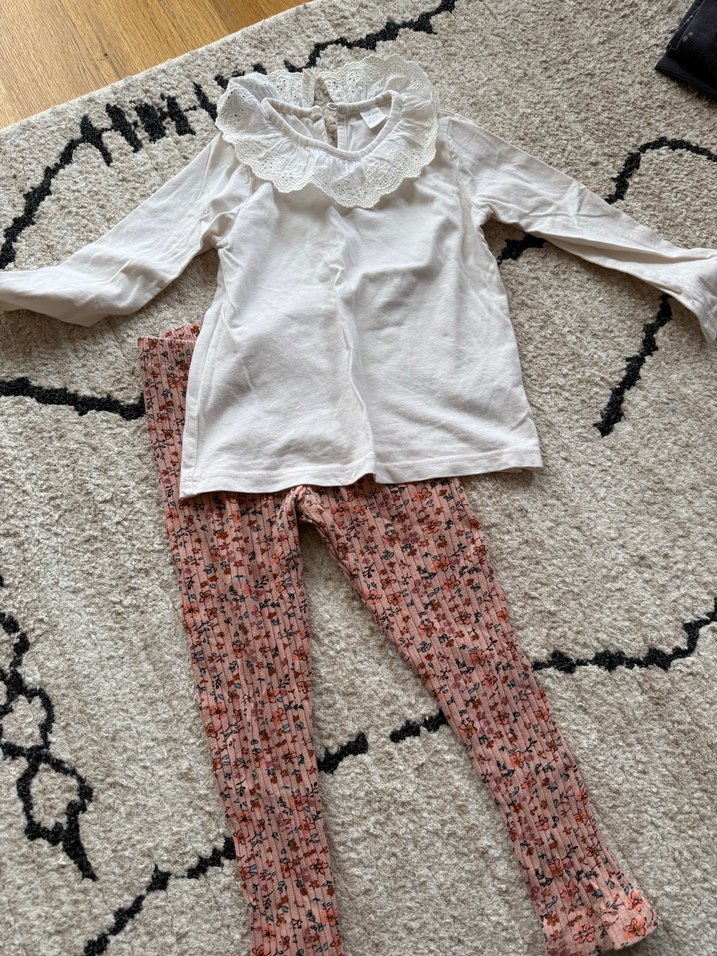 Uzun kollu beyaz dantel yakalı üst ve pastel tonlarda çiçek desenli, örme pembe tayttan oluşan rahat bebek takımı. 3-4 yaş üst hiç giyilmedi