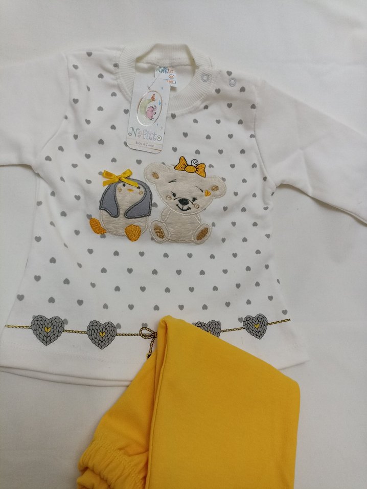 Uzun kollu beyaz üstü renkli kalp desenli ve sevimli örgü ayı ile penguen figürlü, yumuşak sarı pantolonlu bebek kız takımı. 2 yaş