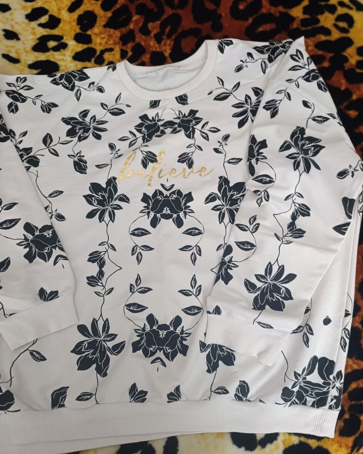 Uzun kollu, yuvarlak yaka ve bol kesim kadın sweatshirtü. Beyaz zemin üzerinde gri çiçek desenleri ve baskılı yazı detayı bulunur. Rahat ve trend sokak stili için uygundur.