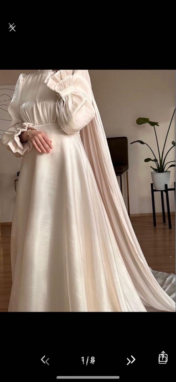 Uzun kollu, yüksek yakalı ve dökümlü tasarıma sahip beyaz gelinlik, modern klasik düğünler için uygundur. Saten kumaşa sahip yalnızca nişanda giyildi. Yıkandı , ütüsü yapılmadı. Şal ve tacıda yanında gönderilecektir