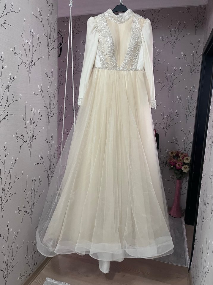 Uzun kollu, yüksek yakalı ve drape detaylı, beyaz renkli, klasik ve göz alıcı tarzda nişan elbisesi. Sade ve şık tasarımı ile düğünlere uygundur. Abiye elbisesi veya nişan elbisesi