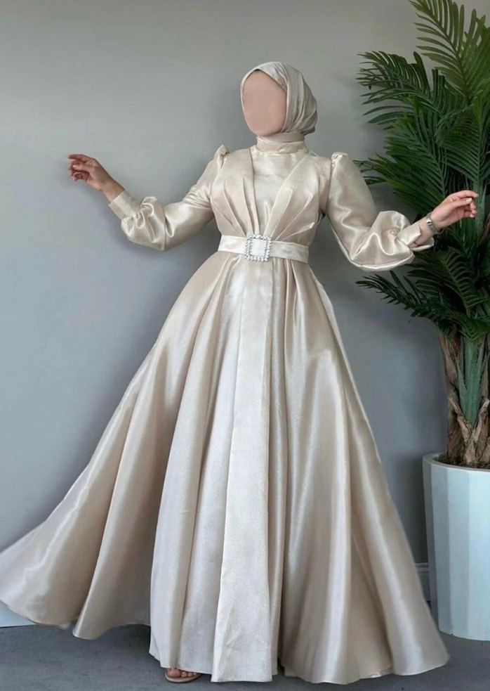Uzun kollu, yüksek yakalı beyaz abiye elbise, drapeli detaylar ve kemerli bel ile şık bir görünüm sunar. Düğün için uygundur.