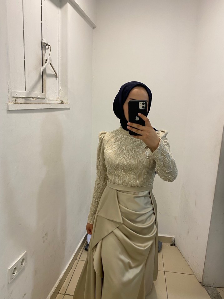 Drapeli tasarımı, yüksek yaka ve uzun kollu kesimi ile beyaz, dar kesim modern klasik abiye elbise, düğün için uygundur. ✨