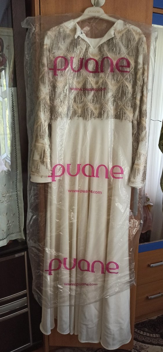 Uzun kollu, drapeli ve baskılı detaylara sahip krem uzun elbise. Salaş kesimi ve yuvarlak yakası ile şık bir düğün tercihidir.
